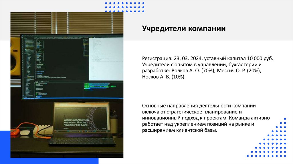 Учредители компанииРегистрация: 23. 03. 2024, уставный капитал 10 000 руб.