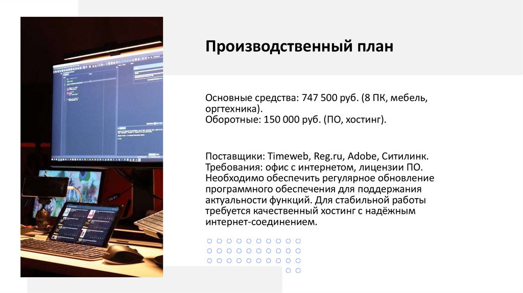 Производственный планОсновные средства: 747 500 руб. (8 ПК, мебель,