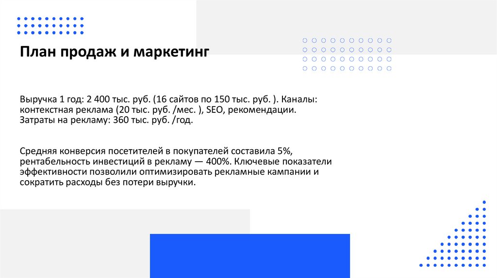 План продаж и маркетингВыручка 1 год: 2 400 тыс. руб. (16 сайтов по 150 тыс. руб. ). Каналы: