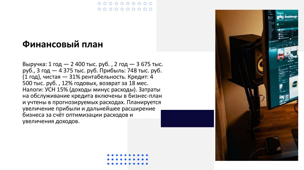 Финансовый планВыручка: 1 год — 2 400 тыс. руб. , 2 год — 3 675 тыс.