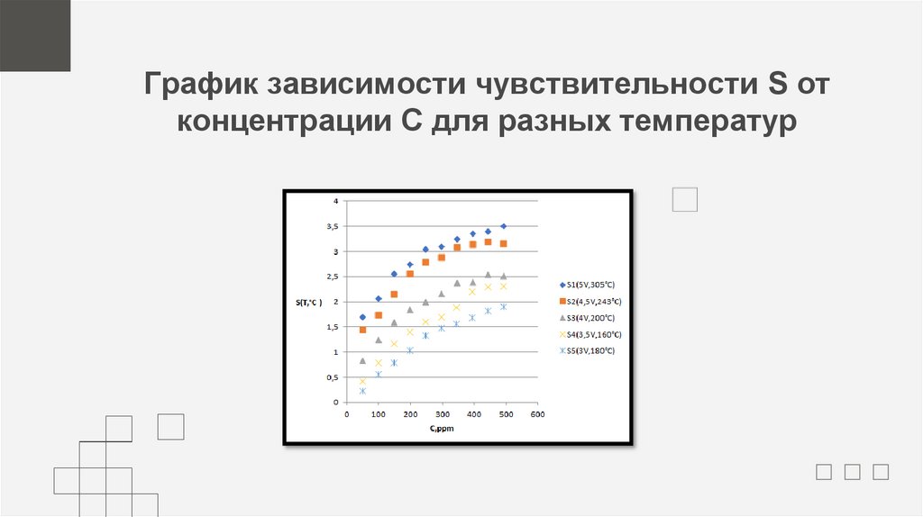 График зависимости чувствительности S отконцентрации C для разных температур