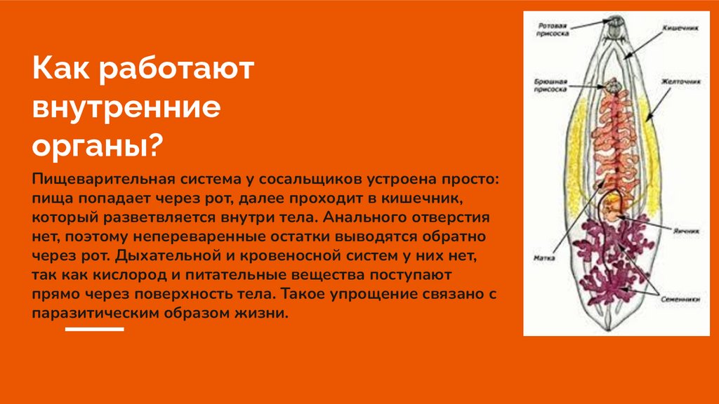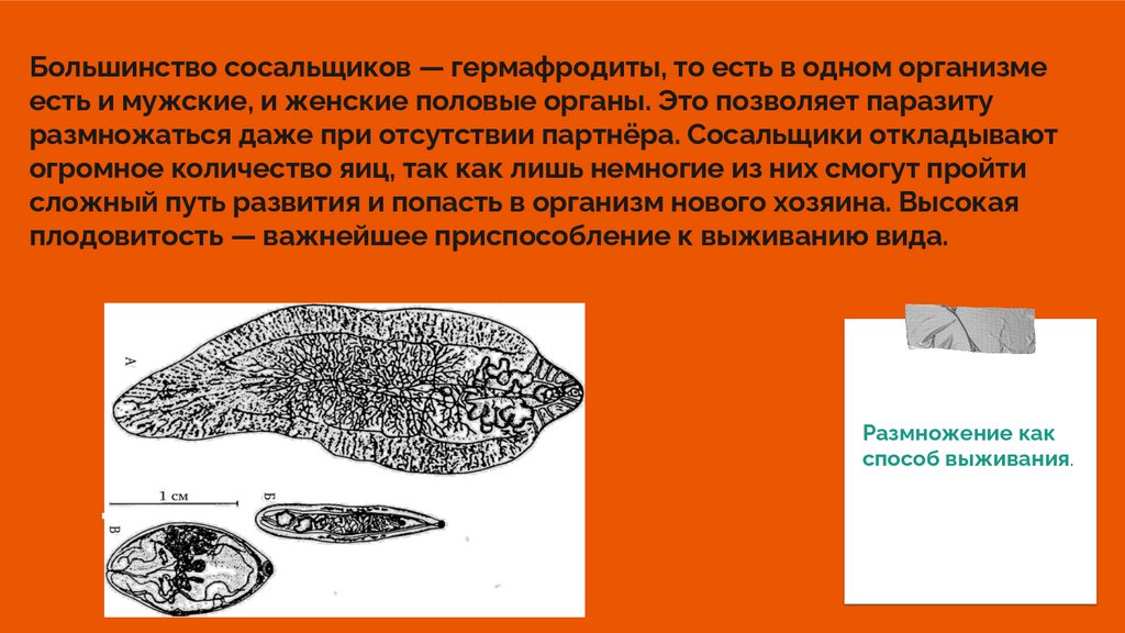 Большинство сосальщиков — гермафродиты, то есть в одном организмеесть и мужские, и женские половые органы. Это позволяет паразиту