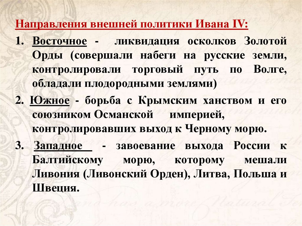 Направления внешней политики Ивана IV:1. Восточное - ликвидация осколков Золотой