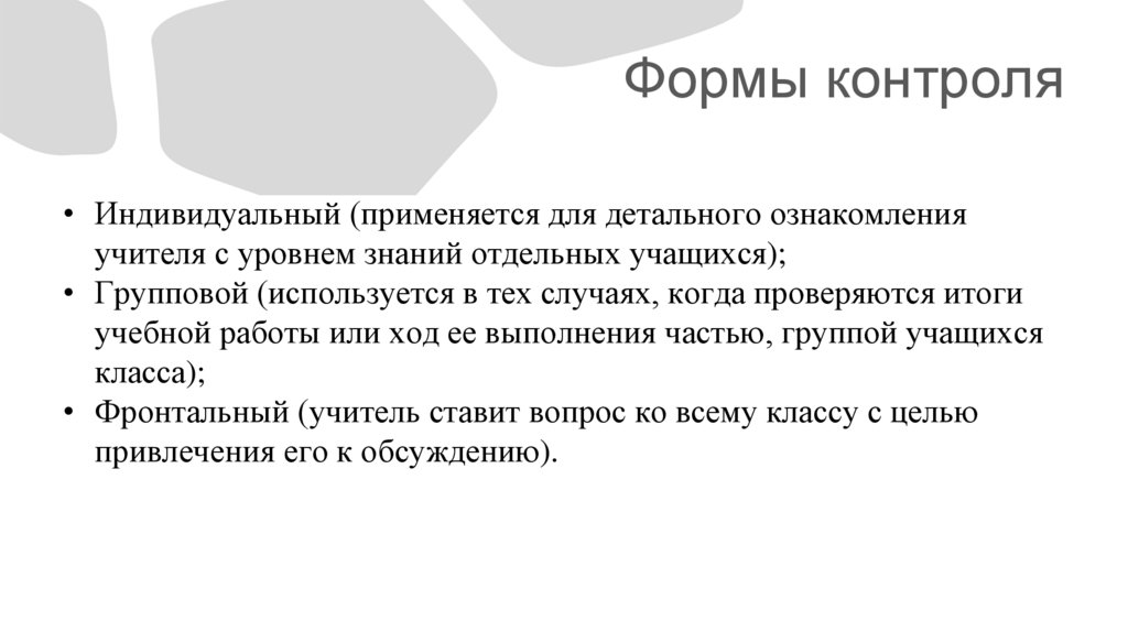 Формы контроля• Индивидуальный (применяется для детального ознакомления