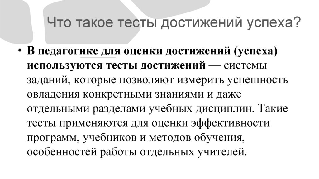 Что такое тесты достижений успеха?• В педагогике для оценки достижений (успеха)