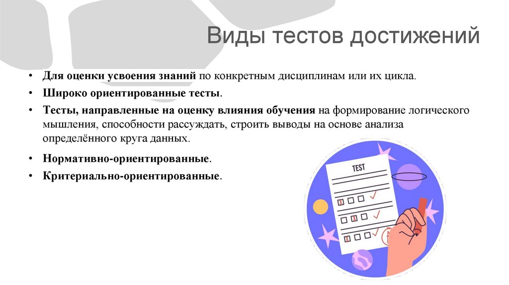 Виды тестов достижений• Для оценки усвоения знаний по конкретным дисциплинам или их цикла.
