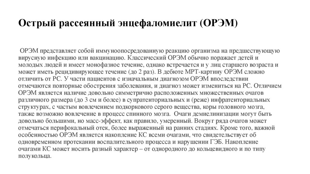 Острый рассеянный энцефаломиелит (ОРЭМ)ОРЭМ представляет собой иммуноопосредованную реакцию организма на предшествующую