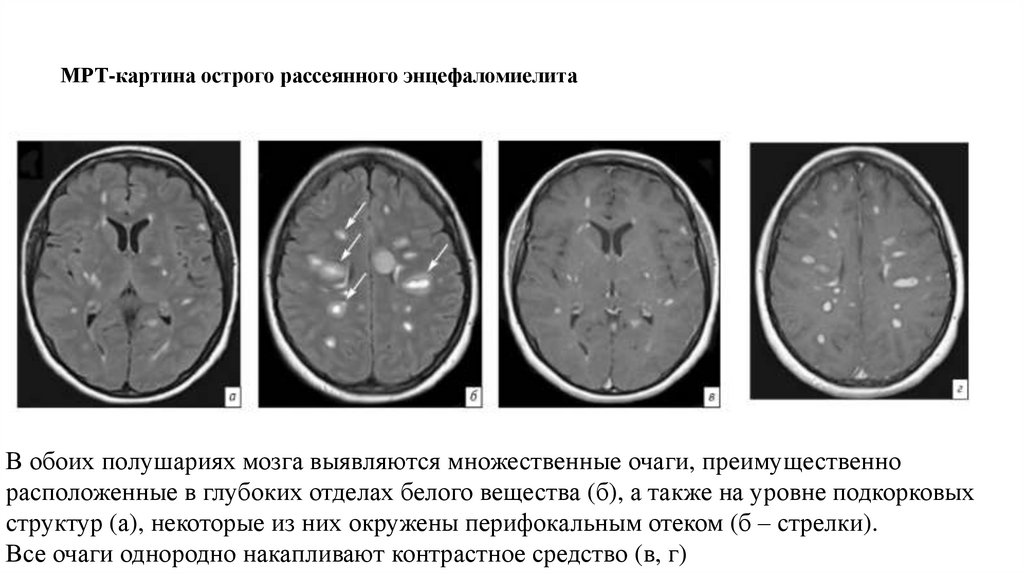 МРТ-картина острого рассеянного энцефаломиелитаВ обоих полушариях мозга выявляются множественные очаги, преимущественно