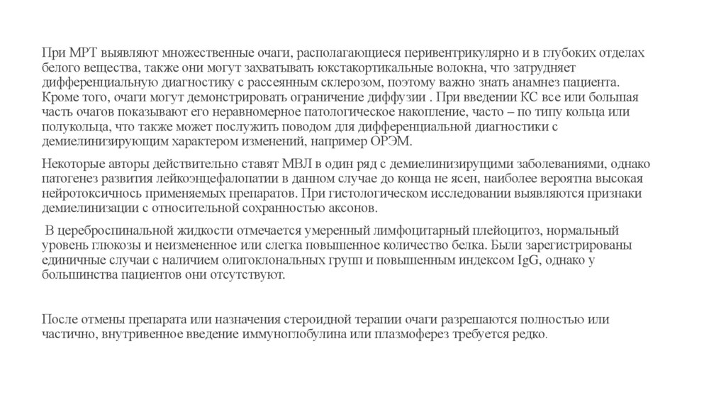 При МРТ выявляют множественные очаги, располагающиеся перивентрикулярно и в глубоких отделахбелого вещества, также они могут захватывать юкстакортикальные волокна, что затрудняет