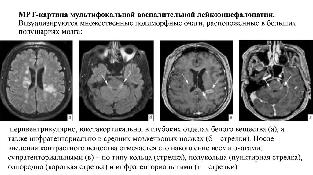 МРТ-картина мультифокальной воспалительной лейкоэнцефалопатии.Визуализируются множественные полиморфные очаги, расположенные в больших