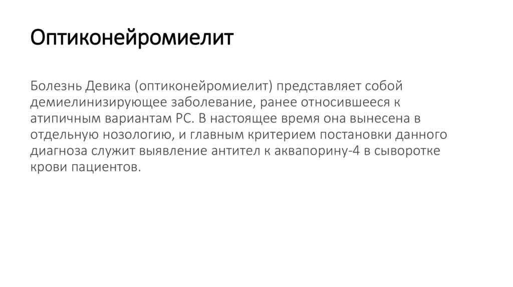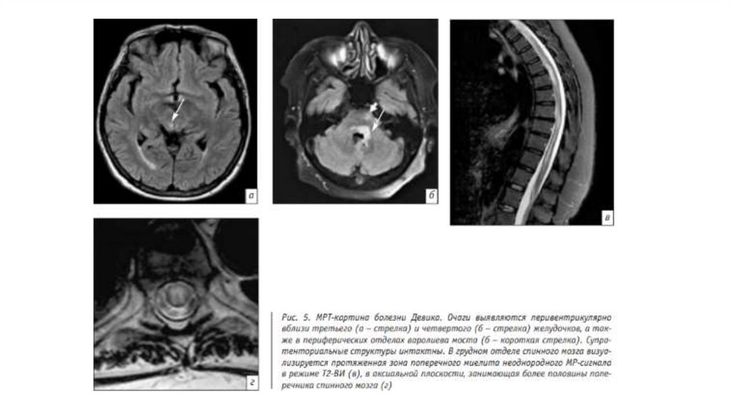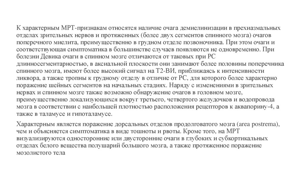 К характерным МРТ-признакам относятся наличие очага демиелинизации в прехиазмальныхотделах зрительных нервов и протяженных (более двух сегментов спинного мозга) очагов