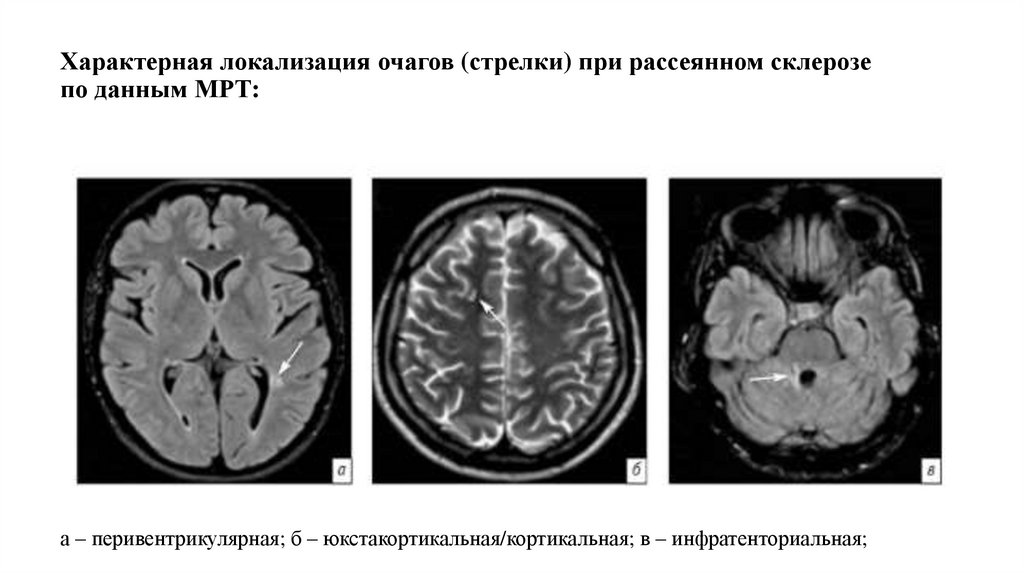 а – перивентрикулярная; б – юкстакортикальная/кортикальная; в – инфратенториальная;