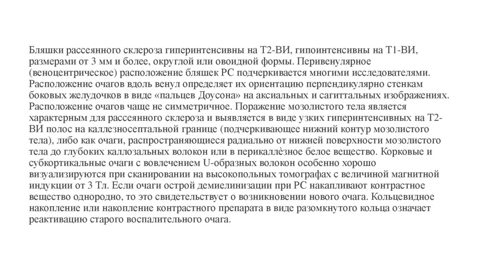 Бляшки рассеянного склероза гиперинтенсивны на Т2-ВИ, гипоинтенсивны на Т1-ВИ,размерами от 3 мм и более, округлой или овоидной формы. Перивенулярное