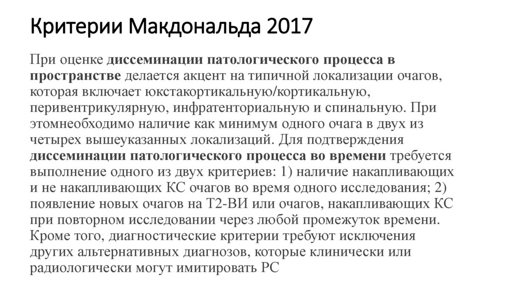 Критерии Макдональда 2017При оценке диссеминации патологического процесса в