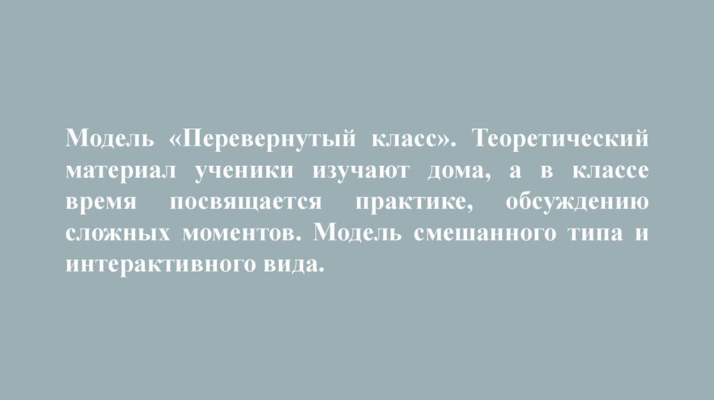 Модель «Перевернутый класс». Теоретическийматериал ученики изучают дома, а в классе