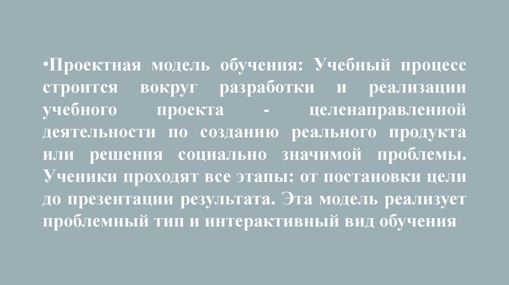 •Проектная модель обучения: Учебный процессстроится вокруг разработки и реализации