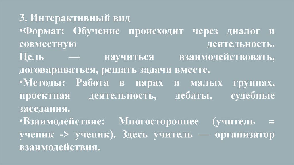 •Взаимодействие: Многостороннее (учитель =