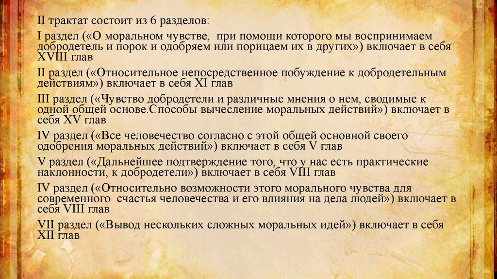 II трактат состоит из 6 разделов:I раздел («О моральном чувстве, при помощи которого мы воспринимаем
