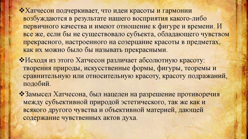 Хатчесон подчеркивает, что идеи красоты и гармониивозбуждаются в результате нашего восприятия какого-либо
