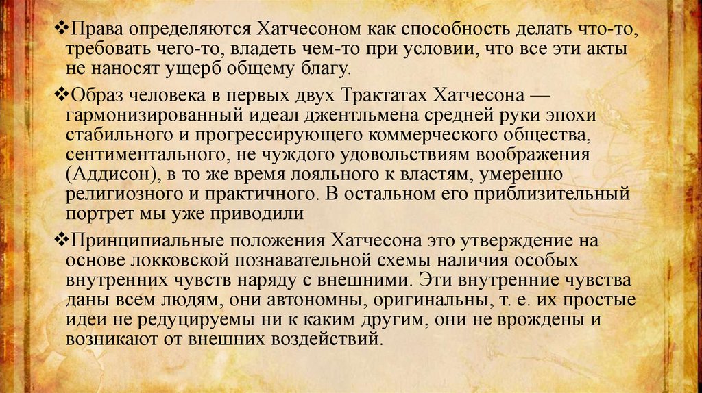 Права определяются Хатчесоном как способность делать что-то,требовать чего-то, владеть чем-то при условии, что все эти акты