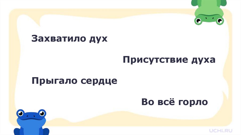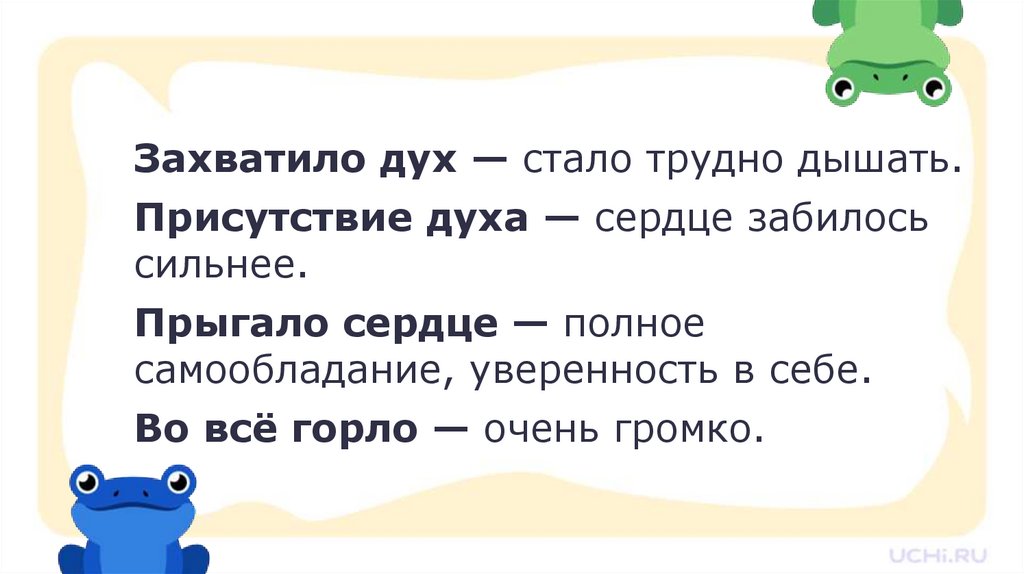 Захватило дух — стало трудно дышать.Присутствие духа — сердце забилось