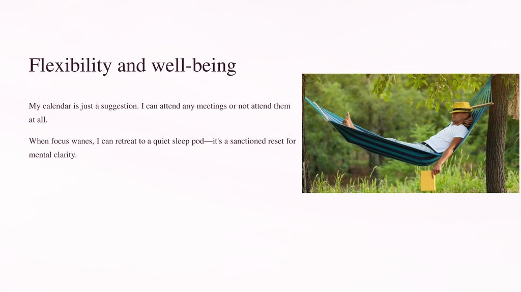 Flexibility and well-beingMy calendar is just a suggestion. I can attend any meetings or not attend them
