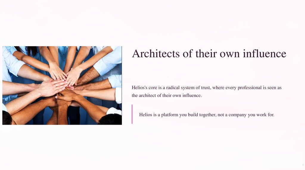 Architects of their own influenceHelios's core is a radical system of trust, where every professional is seen as