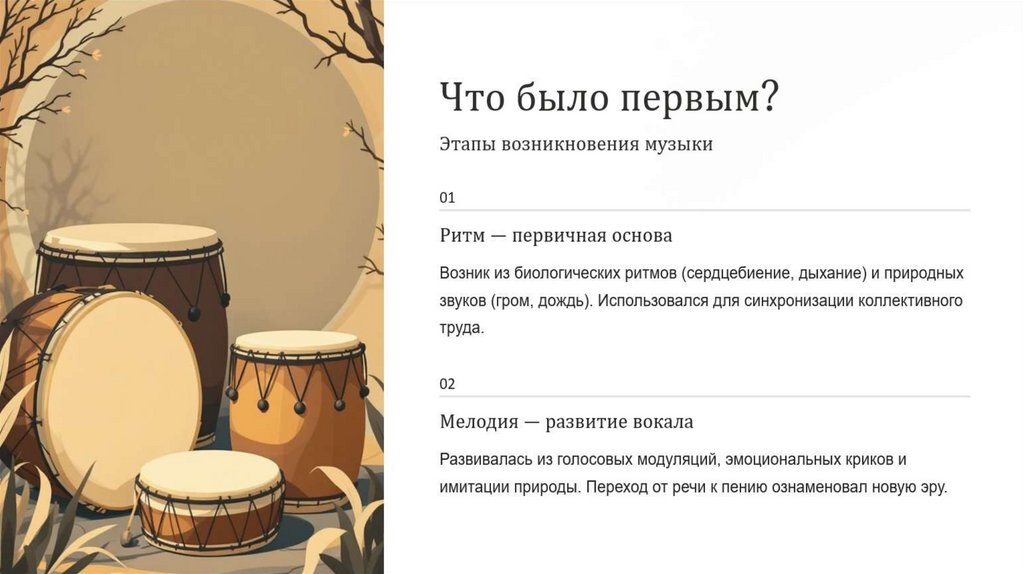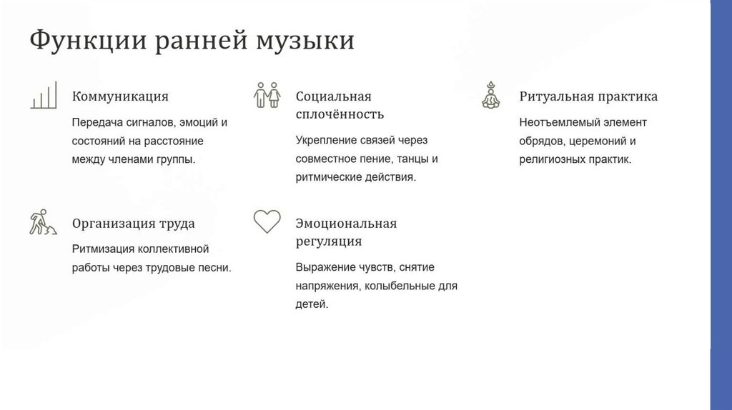 • В древние времена музыка служила религиозным ритуалам и передаче устной традиции.