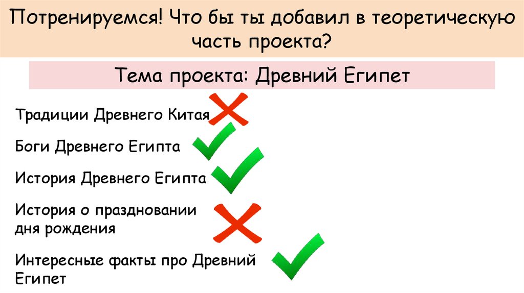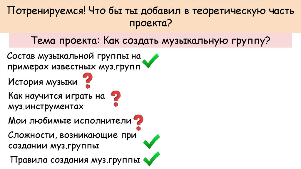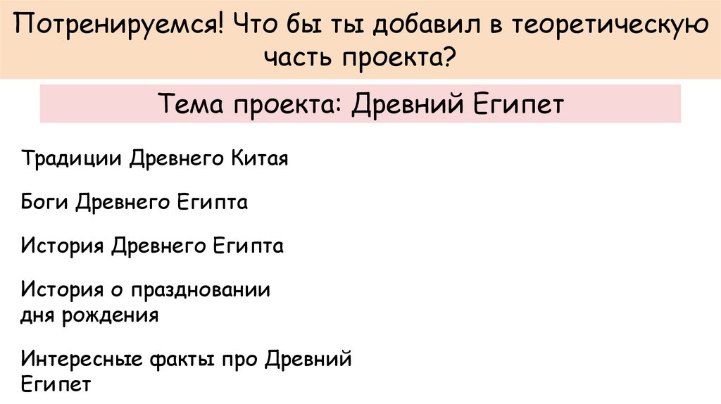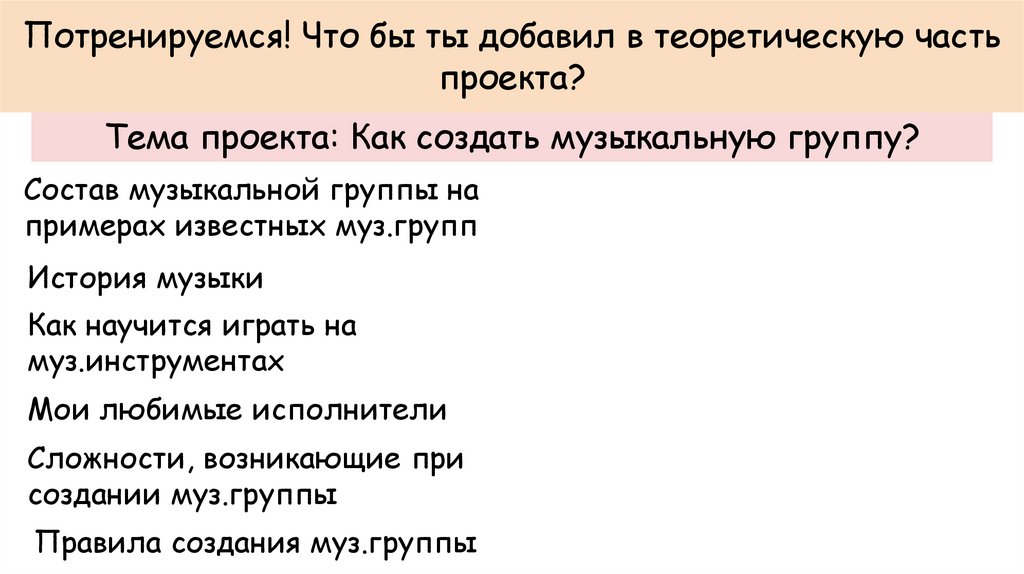 Потренируемся! Что бы ты добавил в теоретическую частьпроекта?