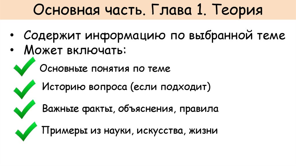 Основная часть. Глава 1. Теория• Содержит информацию по выбранной теме