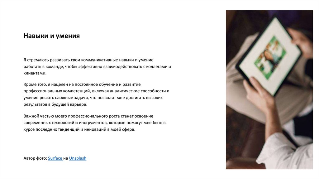 Навыки и уменияЯ стремлюсь развивать свои коммуникативные навыки и умение