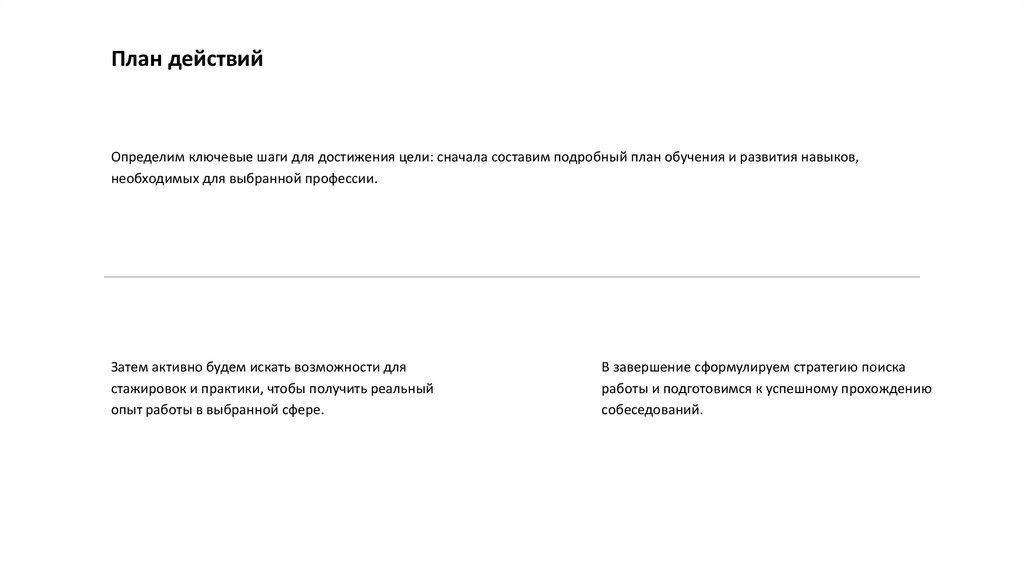 План действийОпределим ключевые шаги для достижения цели: сначала составим подробный план обучения и развития навыков,
