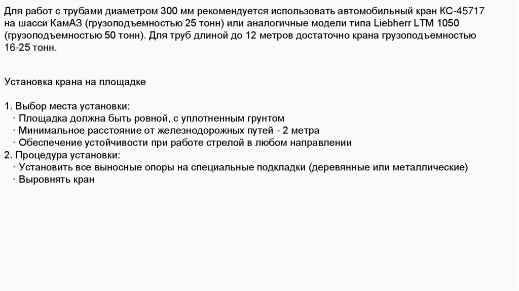 Для работ с трубами диаметром 300 мм рекомендуется использовать автомобильный кран КС-45717на шасси КамАЗ (грузоподъемностью 25 тонн) или аналогичные модели типа Liebherr LTM 1050