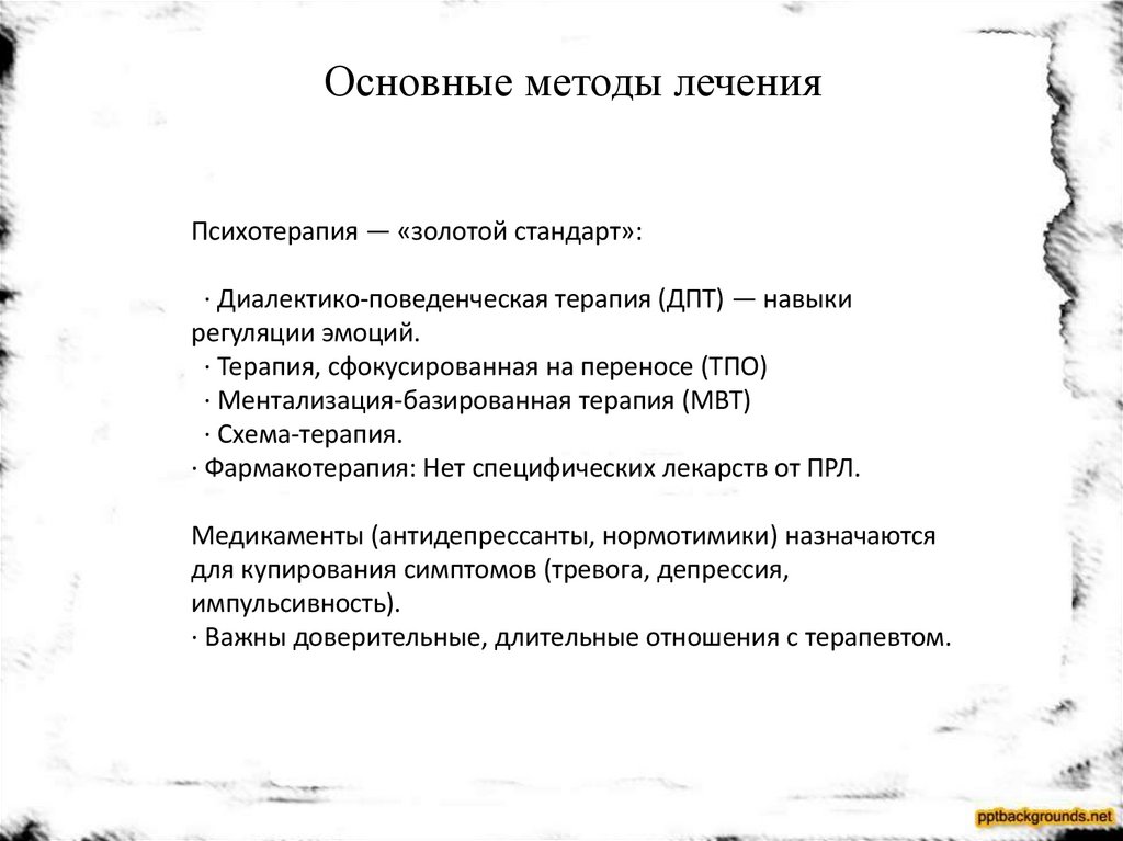 · Фармакотерапия: Нет специфических лекарств от ПРЛ.