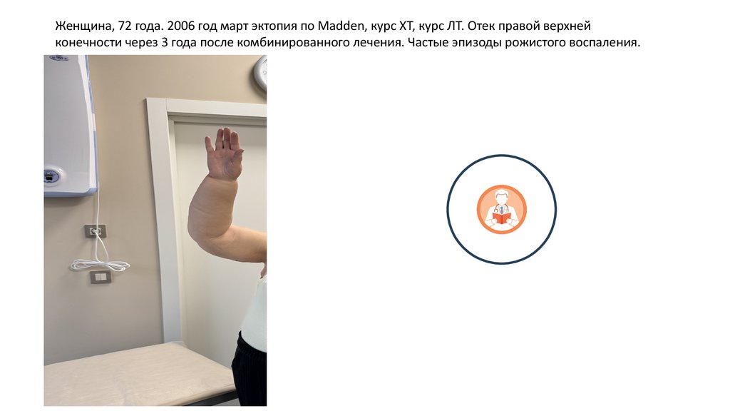 Женщина, 72 года. 2006 год март эктопия по Madden, курс ХТ, курс ЛТ. Отек правой верхнейконечности через 3 года после комбинированного лечения. Частые эпизоды рожистого воспаления.