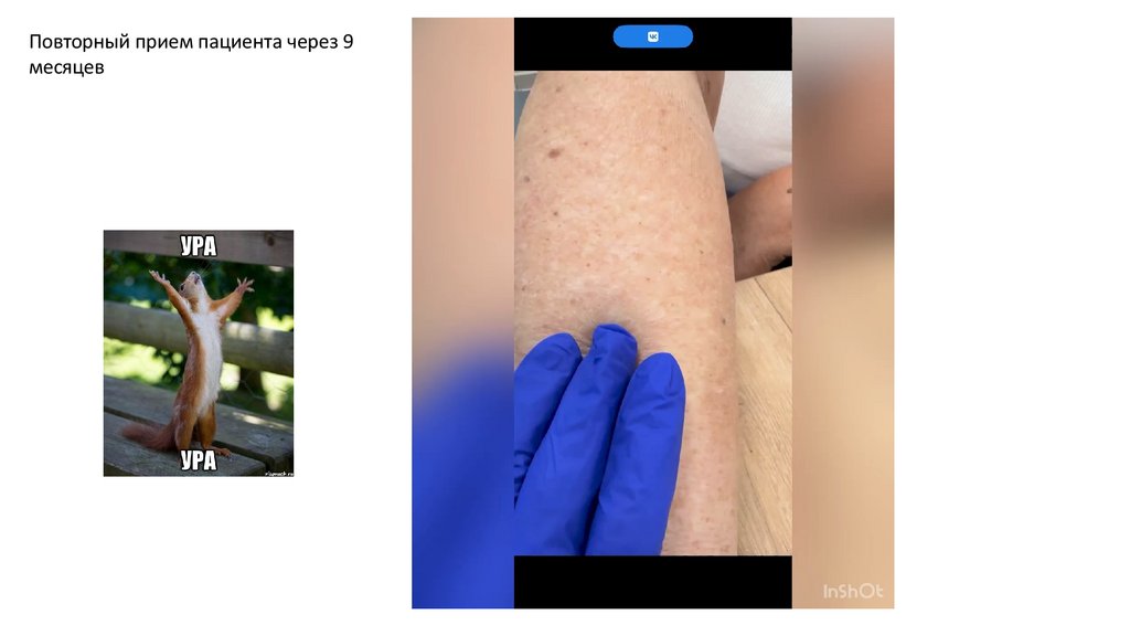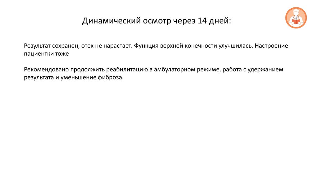 Динамический осмотр через 14 дней:Результат сохранен, отек не нарастает. Функция верхней конечности улучшилась. Настроение