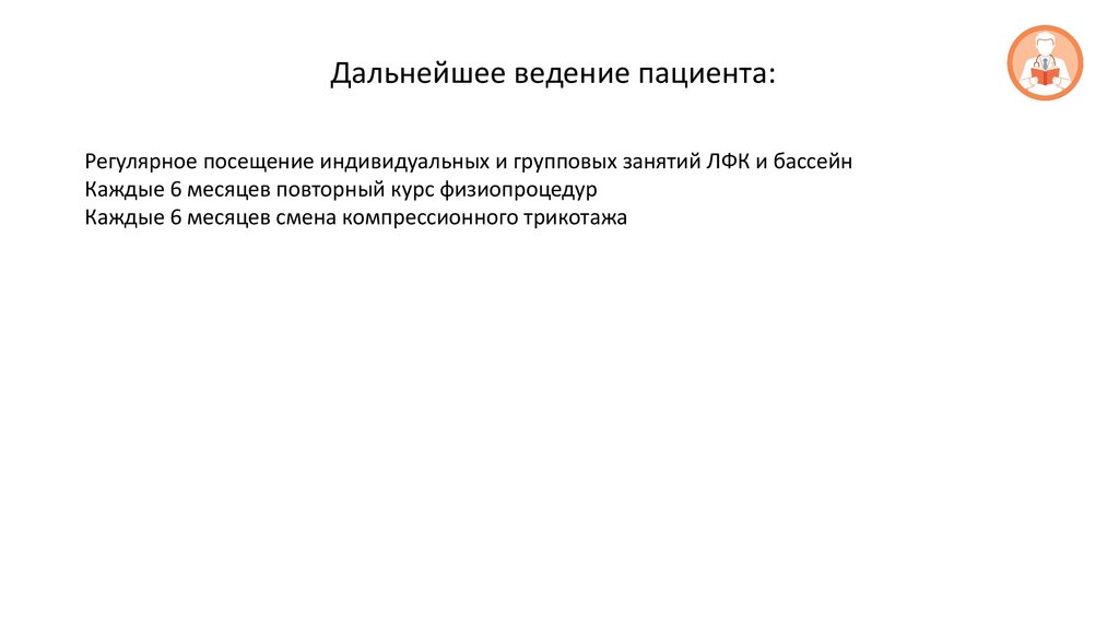 Дальнейшее ведение пациента:Регулярное посещение индивидуальных и групповых занятий ЛФК и бассейн