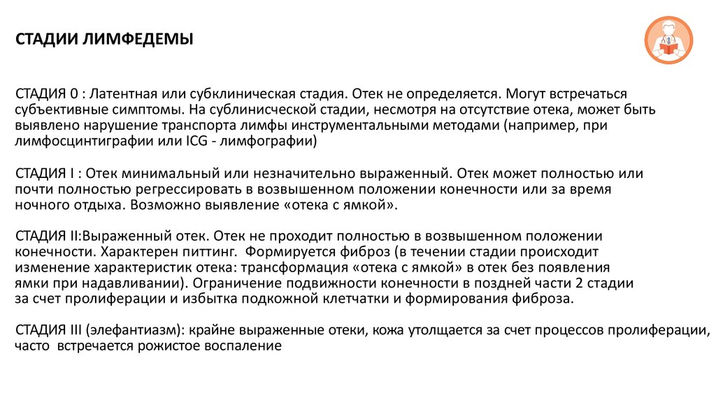 СТАДИИ ЛИМФЕДЕМЫСТАДИЯ 0 : Латентная или субклиническая стадия. Отек не определяется. Могут встречаться