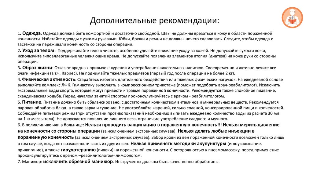 Дополнительные рекомендации:1. Одежда: Одежда должна быть комфортной и достаточно свободной. Швы не должны врезаться в кожу в области пораженной