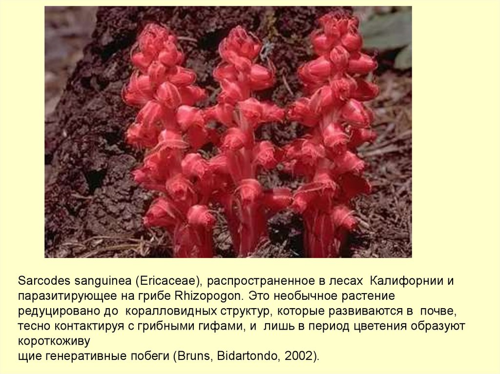 Sarcodes sanguinea (Ericaceae), распространенное в лесах Калифорнии ипаразитирующее на грибе Rhizopogon. Это необычное растение