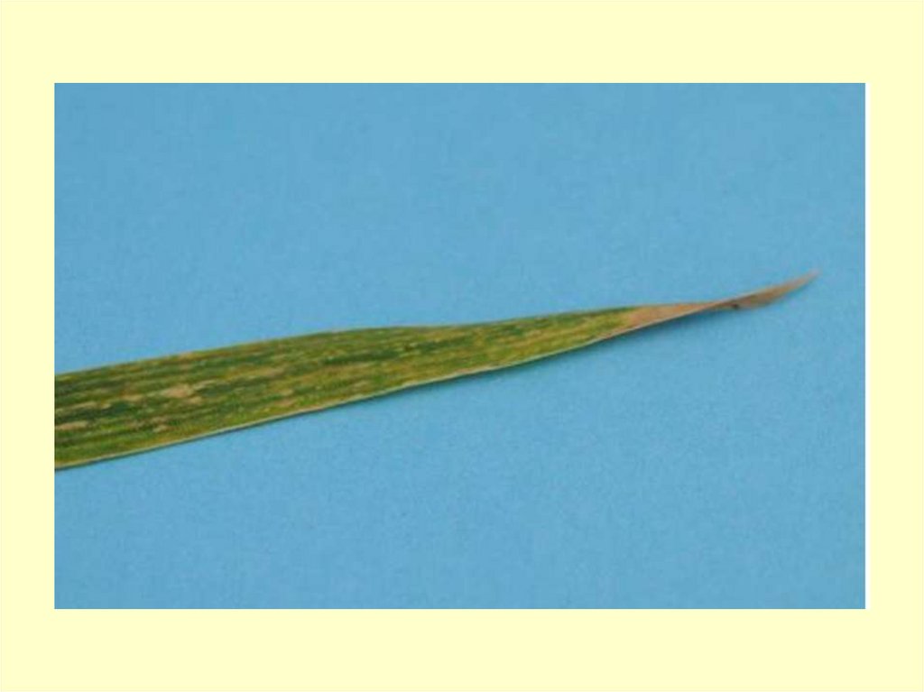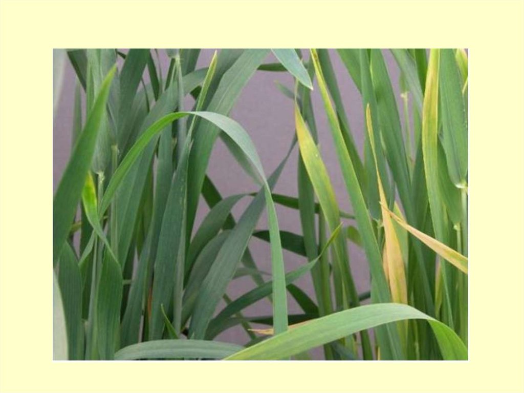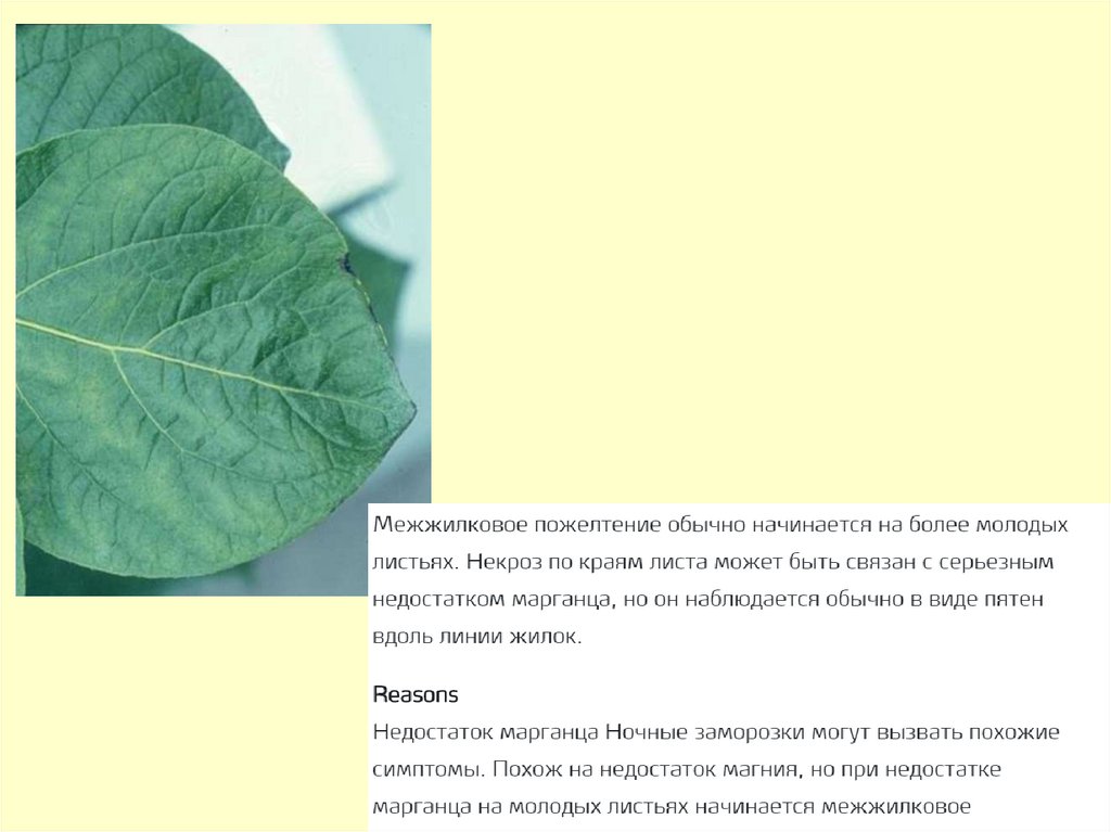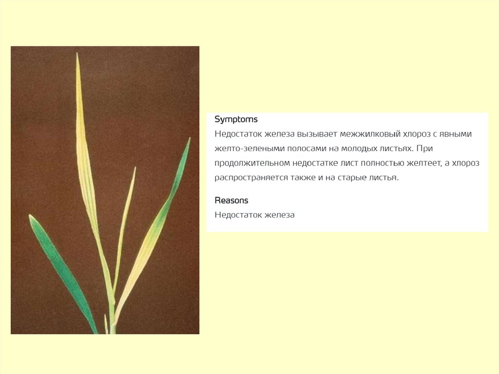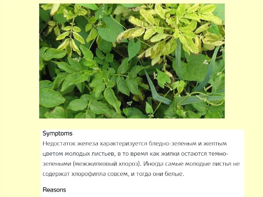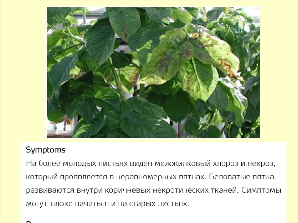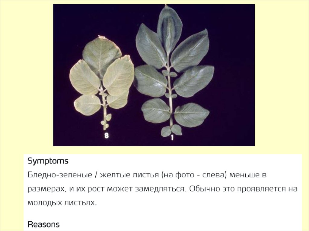 Фото 1) Старые листья приобретают равномерную окраску от бледно-зеленогодо желтого; позже симптомы распространяются на молодые листья. (Фото 2)
