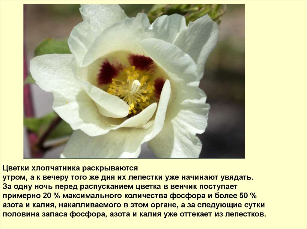 Цветки хлопчатника раскрываютсяутром, а к вечеру того же дня их лепестки уже начинают увядать.