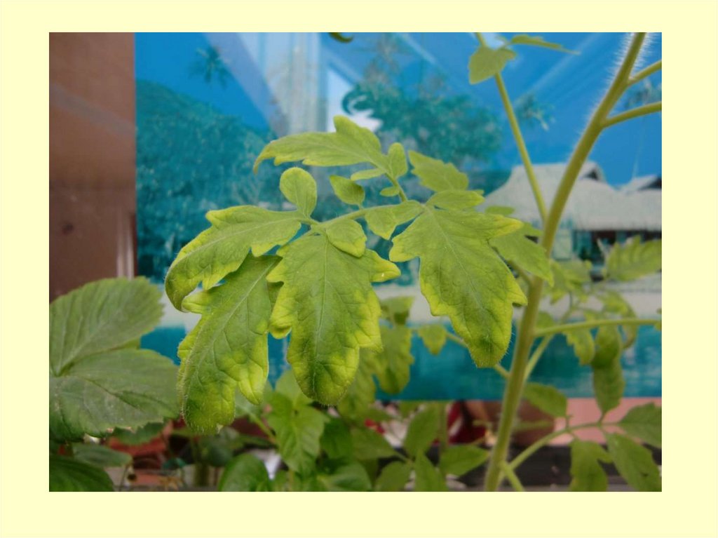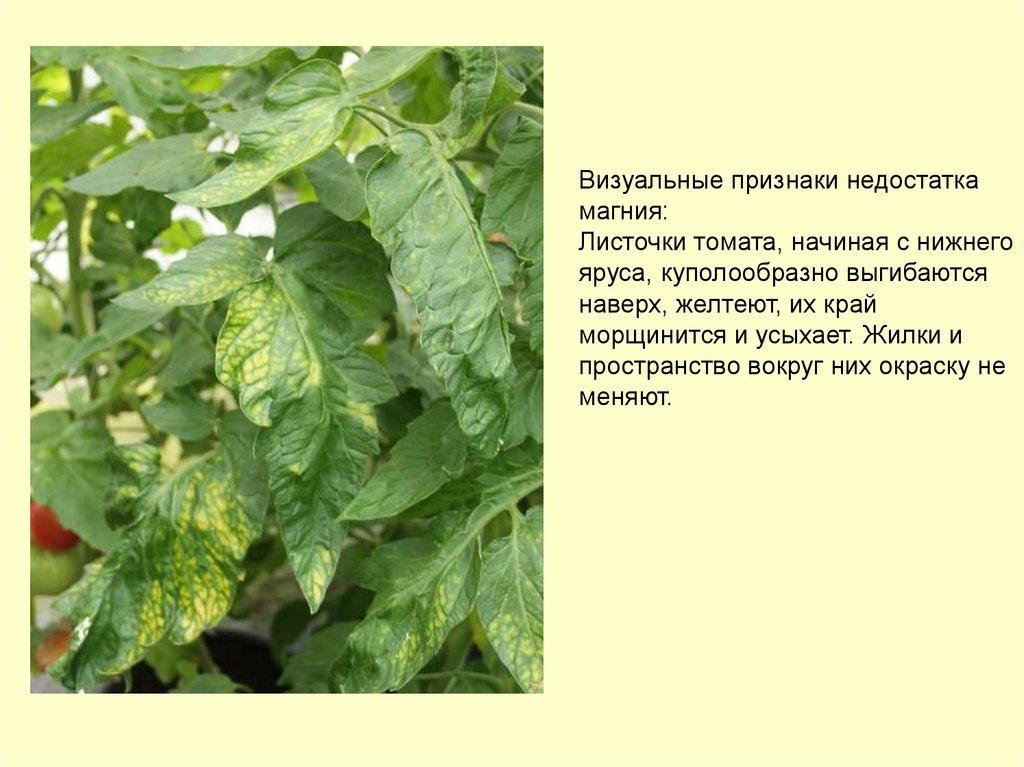 Первыми высветляются и скручиваются нижние листья томатов. При этом жилки сих тыльной стороны приобретают голубоватый оттенок с красным отливом. Такой
