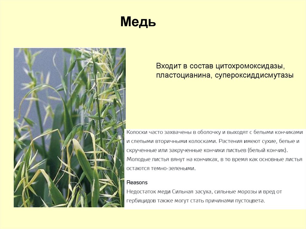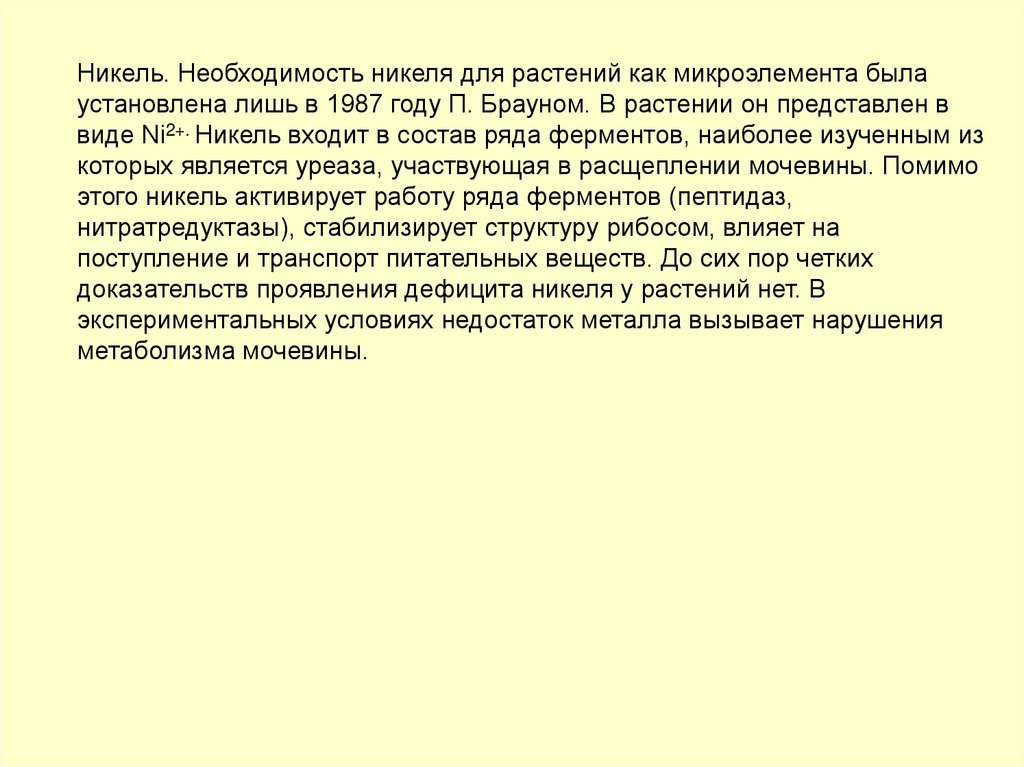 Никель. Необходимость никеля для растений как микроэлемента былаустановлена лишь в 1987 году П. Брауном. В растении он представлен в