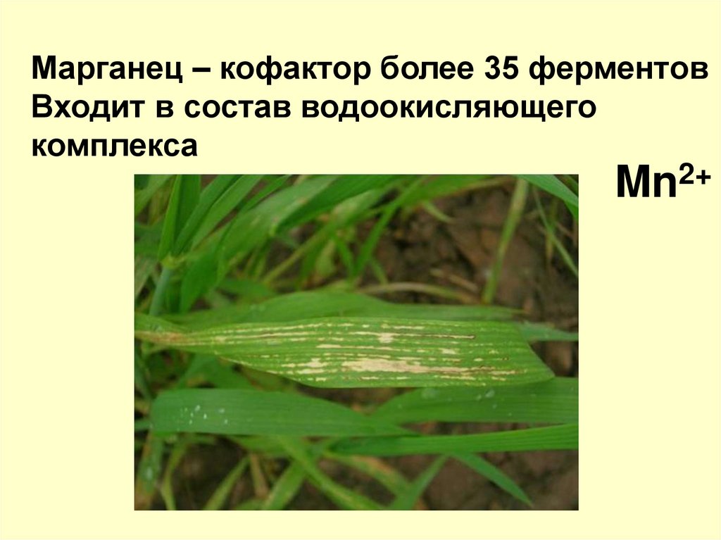 Марганец – кофактор более 35 ферментовВходит в состав водоокисляющего