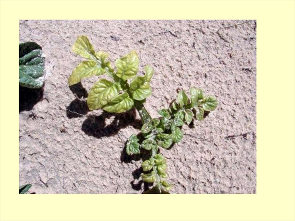 задержка в развитии растений. Новая листва растет мелкой, матовой, бледнозеленой. Наступает преждевременное цветение. Образуются мелкие плоды и, как