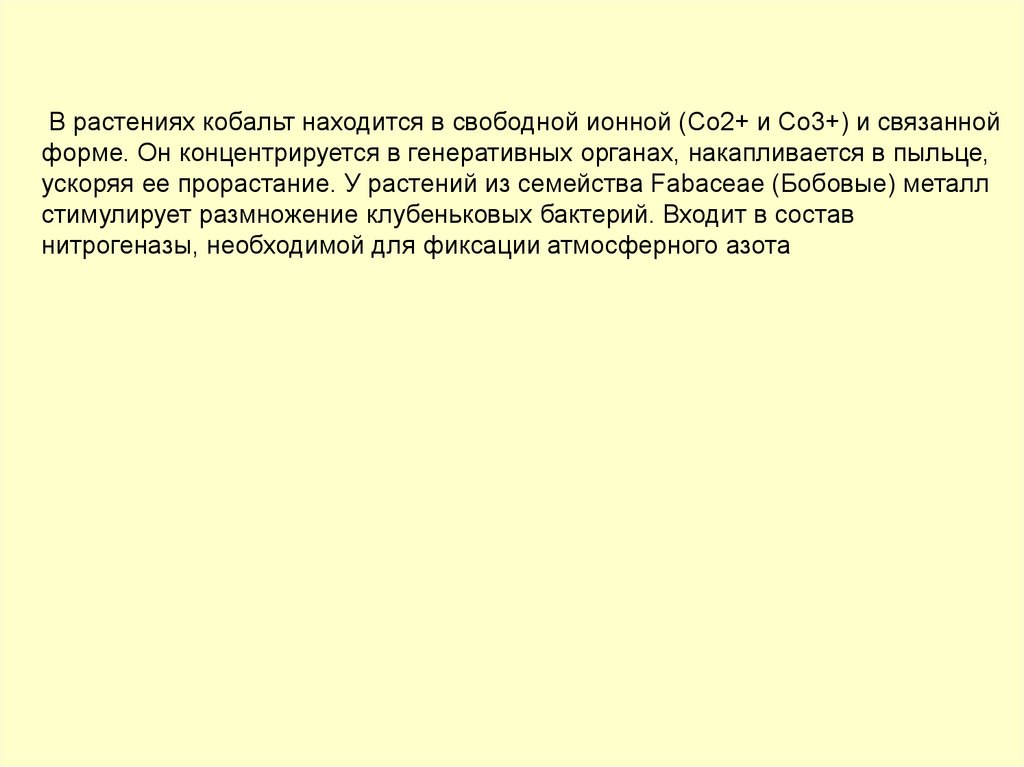 В растениях кобальт находится в свободной ионной (Со2+ и Со3+) и связаннойформе. Он концентрируется в генеративных органах, накапливается в пыльце,