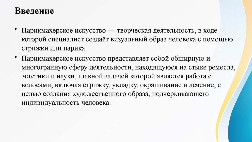 Введение• Парикмахерское искусство — творческая деятельность, в ходе