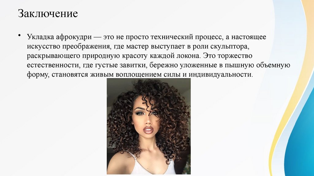 Заключение• Укладка афрокудри — это не просто технический процесс, а настоящее