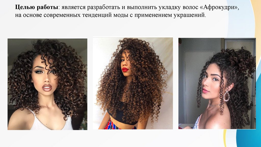 Целью работы: является разработать и выполнить укладку волос «Афрокудри»,на основе современных тенденций моды с применением украшений.